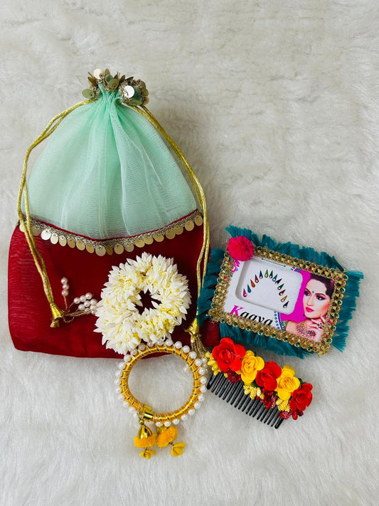 Potli Bag, Scented Gajra Scrunchie, Bangle, Hair Accessory Combo Gifts