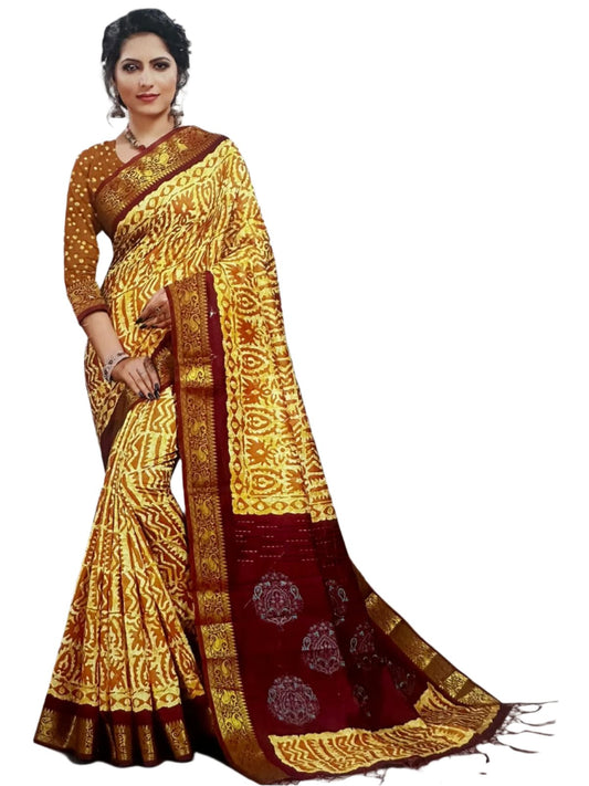 Casual Wear Saree Yellow And Red Zari Border Silk Saree with Tassels