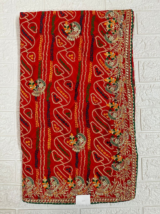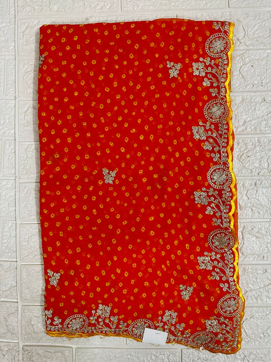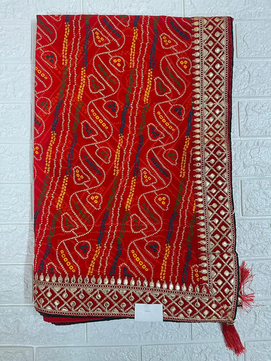 Red Bandhani Saree Georgette Gota Patti Border Traditional Puja Wear Saree