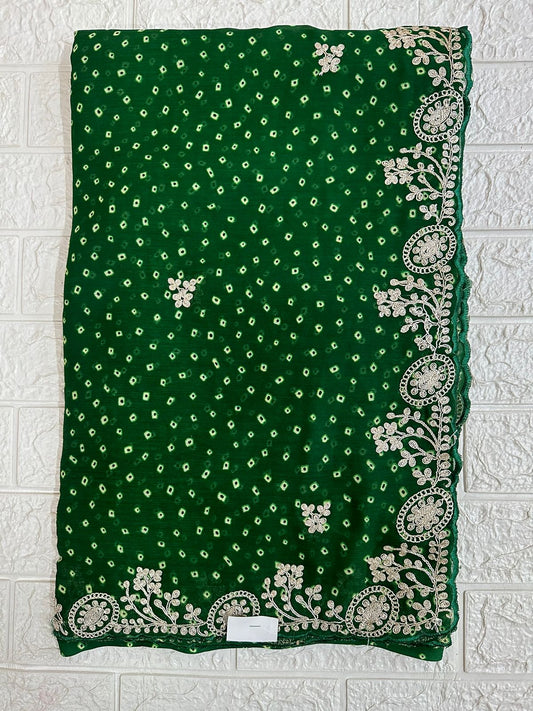 Decent Embroidery Chiffon Bandhani Saree, Pittan Work Embroidered Party Wedding Wear Saree