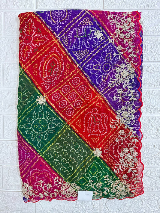 Multicolor Pittan Work Bandhani Saree, Traditional Embroidered Bandhej Party Wear Sari