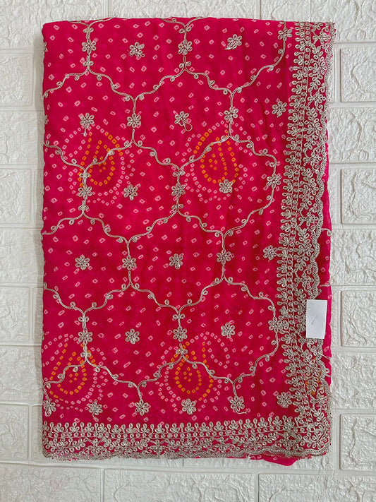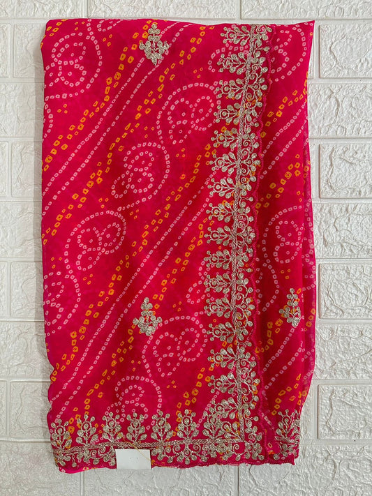 Georgette Pink Bandhani Pittan Work Embroidery Saree Party Wedding Wear Traditional Sari