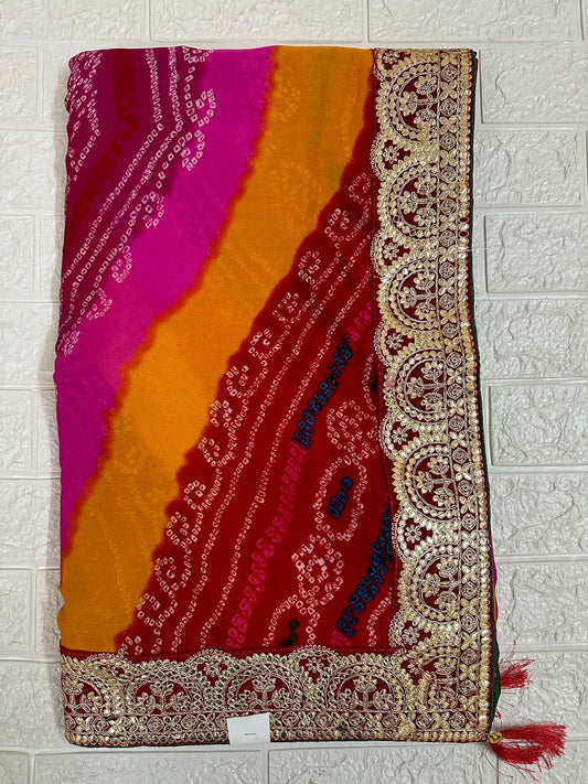 Multicolor Bandhani Saree Pachranga Bandhej Gota Patti Border Saree