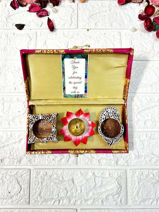 Pichwai Box With T-light Candle Holder & Haldi Kumkum Plate Diwali Gifts, Wedding Return Gifts